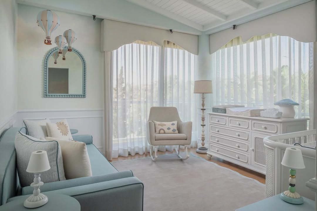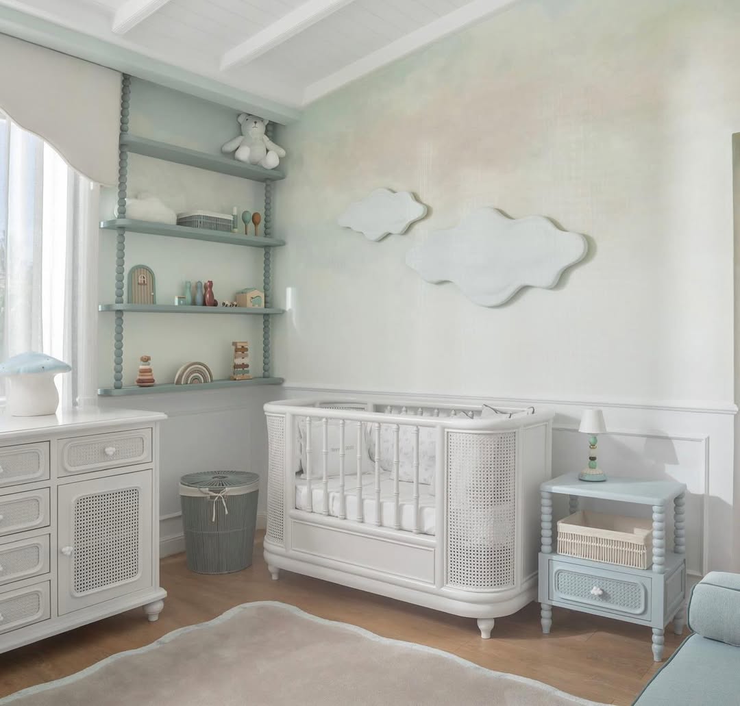 Une chambre inspirée du ciel et de l’imaginaire enfantin; courbes douces, matières naturelles et tons pastels pour accueillir les premiers rêves d’un petit être.